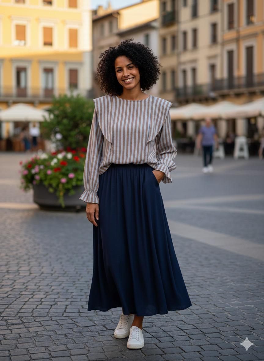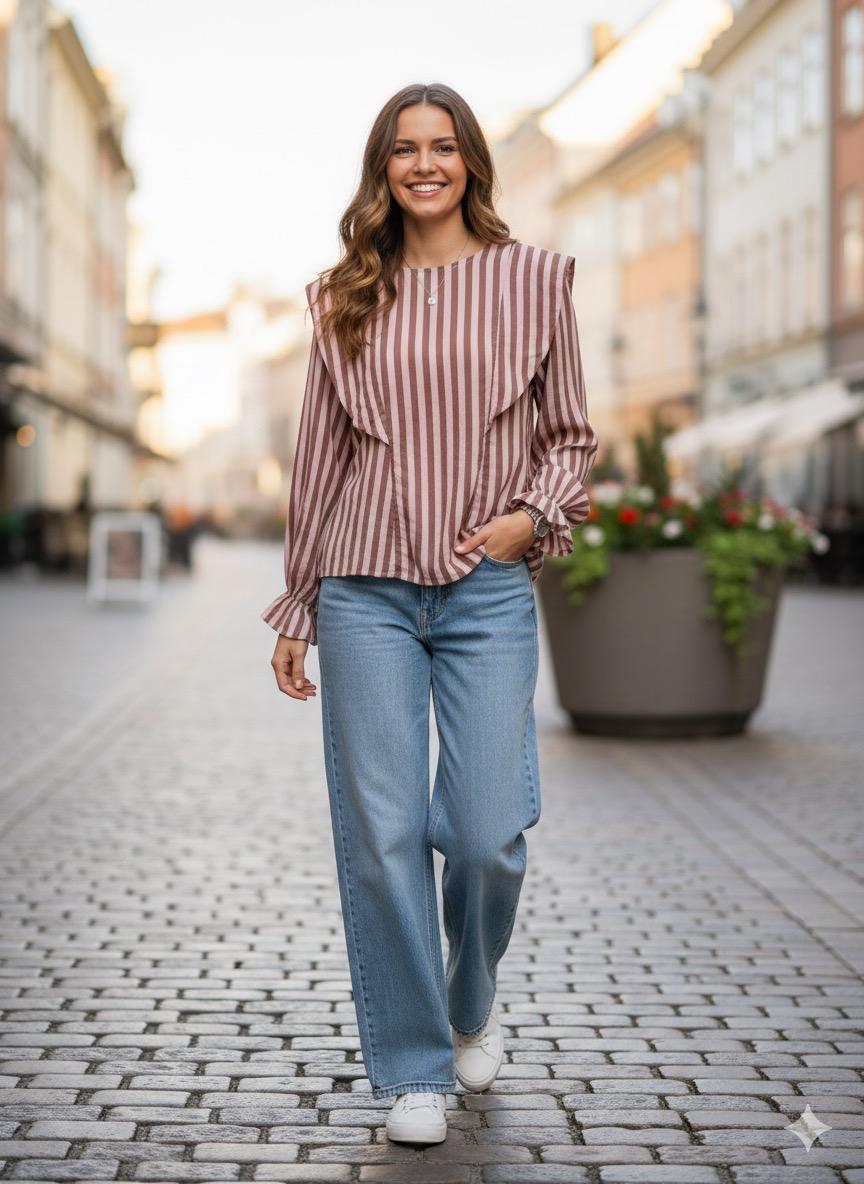 Camisa de manga larga con diseño de rayas verticales que estiliza la silueta. Destaca por su detalle de volante en la parte delantera, que aporta un toque femenino y elegante. Los puños fruncidos y su tejido ligero la convierten en una prenda cómoda y fácil de llevar.