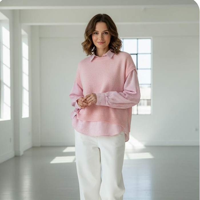 Jersey de punto en tono rosa empolvado con cuello redondo. Diseño combinado con mangas y bajo efecto camisa a rayas. Talla única, (Tallaje par 38–40 y 42), con largo ligeramente más amplio para mayor comodidad. Versátil y fácil de combinar, ideal para looks casuales con un toque diferente.